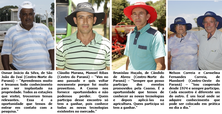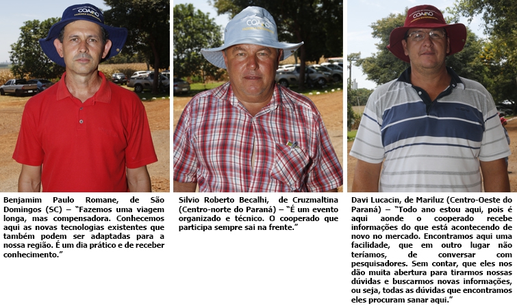 Segundo o engenheiro agrônomo José Aroldo Gallassini, diretor-presidente da Coamo, o encontro é realizado todos os anos para as culturas de verão e inverno, com bons resultados e uma grande procura. “São sempre as mais recentes tecnologias. O trabalho tem validade oficial porque é feito por institutos de pesquisas no local”, comenta. Ele acrescenta que são novidades que os cooperados recebem em primeira mão, com aulas dadas direto pelos pesquisadores. “Tudo que tem de novo é apresentado a cada ano porque todos os anos tem novidade. Temos um trabalho grande e a procura do cooperado é muito significativa”, completa Gallassini.