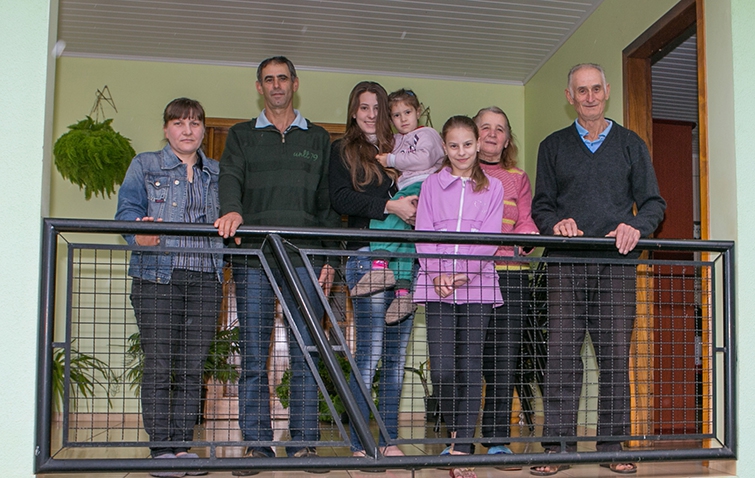A propriedade tem 54 alqueires e no verão predomina o cultivo de soja, conforme relata Nilson. “Somos produtores de sementes para a Coamo já há algum tempo. Por isso, temos investido sempre em novas tecnologias que ajudam a alcançar bons resultados”, frisa o cooperado. A atividade leiteira, segundo ‘dona’ Margarete, ajuda a manter a propriedade e o sustento da família. “É com esse dinheiro que pagamos as despesas do mês”, frisa. São 18 animais e em lactação gira entre 12 e 15 com produtividade média de 25 a 30 litros/dia. “Tiramos em torno de sete a oito mil litros/mês no verão e de 10 a 11 mil litros/mês no inverno. Isso porque no verão tem menos pastagem do que no inverno, quando os animais são tratados na aveia com azevém e ração”, explica. Além do casal Nilson e Margarete, moram na propriedade as três filhas, o ‘seo’ Darci e a esposa ‘dona’ Onira. “Trabalhamos em família, em espírito de associativismo. Isso nos fortalece para continuarmos trabalhando. A nossa história começou com o meu pai [‘seo’ Darci] e fomos sempre muito unidos e gratos por tudo”, comenta Nilson.