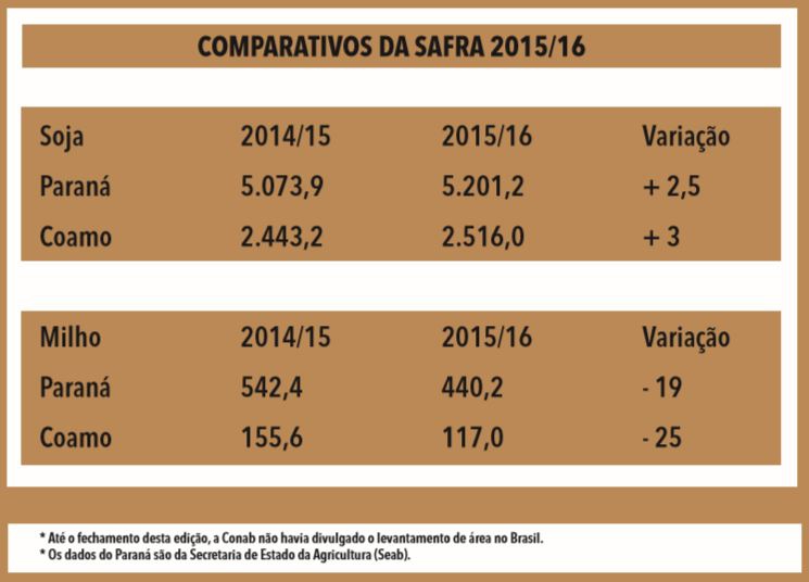 Principal cultura do verão, a soja está ganhando espaço entre os cooperados. De acordo com os primeiros levantamentos da gerência de Assistência Técnica da cooperativa, a área com a oleaginosa deverá subir 3% sobre os 2,44 milhões de hectares da safra 2014/15. Já o milho deve perder cerca de 25% dos 156 mil hectares cultivados na safra passada.