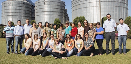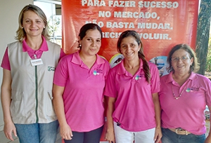 Professora Elaine com as alunas Maria Barbosa, Aline Marconi e Isabel Resende. Ao lado as participantes do curso em Barbosa Ferraz com os funcionários da Coamo |
