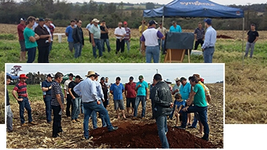 Em Nova Santa Rosa (Oeste do Paraná) foi realizado no dia 14 de agosto um dia de campo sobre os benefícios e o manejo da brachiária ruziziensis. Foi abordado sobre plantio de consórcio brachiária com milho, tendo semeadura a lanço, direta com espaçamento de 90 cm, plantio na mesma linha do milho e semeadura solteira. Foram abertas trincheiras para mostrar o desenvolvimento radicular da brachiária em relação ao milho segunda safra solteiro com plantio direto e, também, abordado o manejo de dessecação para plantio da soja.