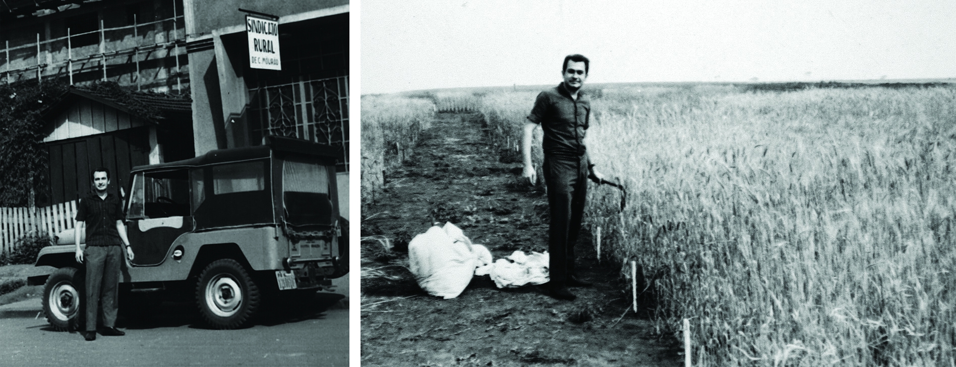 | Dr. Aroldo com o histórico Jeep e, ao lado, conduzindo experimentos de trigo |