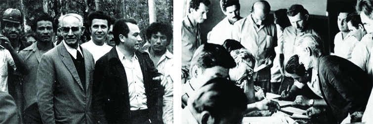 Momentos históricos: assinatura da ata de fundação da Coamo, e evento reunindo funcionários com o, então, presidente Ferri e o gerente Gallassini