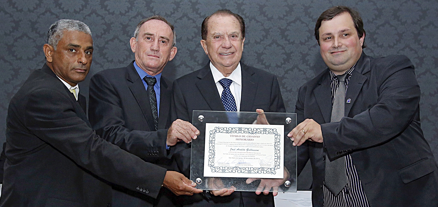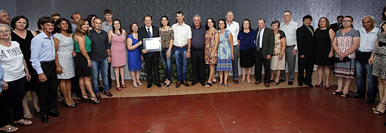 O engenheiro agrônomo José Aroldo Gallassini, idealizador e presidente da Coamo recebeu na noite de 28 de outubro, o título de Cidadão Honorário de São Pedro do Iguaçu (Oeste do Paraná). “Este é um reconhecimento de toda a nossa comunidade, em especial dos agricultores. É um orgulho entregar este título a um cidadão de tamanha magnitude, uma pessoa que vem promovendo o crescimento e a felicidade dos produtores, também em nossa região”, diz Francisco Coelho Prates, presidente da Câmara de Vereadores de São Pedro do Iguaçu. A honraria foi aprovada por unanimidade pelo Poder Legislativo e o evento prestigiado por cooperados, autoridades locais e regionais.