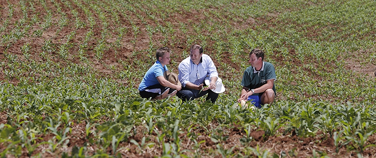| Laércio Dalla Vecchia junto com o filho e o agrônomo José Ricardo avaliam o desenvolvimento do milho de inverno |