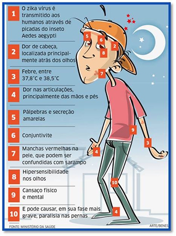 Cerca de 80% das pessoas infectadas pelo vírus Zika não desenvolvem manifestações clínicas. Os principais sintomas são dor de cabeça, febre baixa, dores leves nas articulações, manchas vermelhas na pele, coceira e vermelhidão nos olhos. Outros sintomas menos frequentes são inchaço no corpo, dor