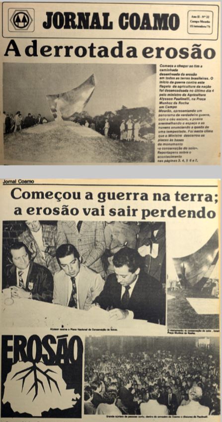 Paolinelli: Lembro bem desse dia, foi no mês de setembro em 1976, foi para lançar o PNCS – Plano Nacional de Conservação de Solos, tinham até construído um obelisco para o evento, mas deu uma chuva tão forte que fomos correndo para um barracão, um armazém na Coamo. Fiquei em cima de uma pilha de sacos de soja e atrás tinha uma pilha alta e uma bandeira nacional. Disse na época ´que enquanto a bandeira nacional estiver sustentada por uma pilha muito alta como essa, de produção de alimentos, o Brasil nunca será um país fraco.´ E é essa bandeira, a da produção de alimentos que vem sustentando e alavancando a nossa economia. O PNCS foi um programa muito importante e promoveu desenvolvimento aos nossos agricultores.