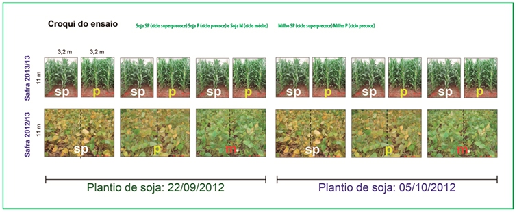 Foram utilizados três cultivares de soja (superprecoce, precoce e média) e dois híbridos de milho (superprecoce e precoce), totalizando 12 combinações, com quatro repetições. As parcelas de soja foram subdivididas para receber milho nas sub-parcelas. O solo do local é um Latossolo Vermelho Distroférrico com 75% de argila, numa altitude de 610 metros. O trabalho foi conduzido e avaliado por três safras consecutivas.