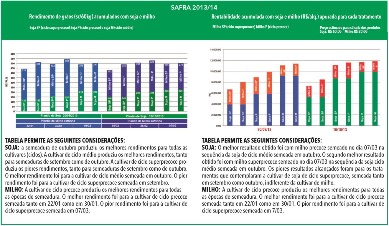 Surgem então, alguns questionamentos: é viável este sistema? Qual a melhor combinação entre soja e milho para as diferentes épocas de semeadura e ciclos das cultivares? É preferível plantar somente a soja na melhor época visando obter o máximo de seu rendimento? Para responder a estes questionamentos, foi instalado na Fazenda Experimental da Coamo o ensaio “Viabilidade econômica do Sistema de Produção Soja e Milho Safrinha para diferentes épocas de semeadura e cultivares”.