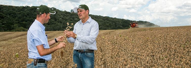 Cooperado Pedro Grégio analisa lavoura com o agrônomo José Eduardo Filho