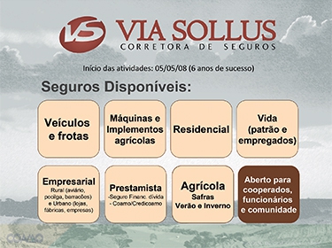A Corretora é responsável pela intermediação entre o segurado e a seguradora buscando produtos que garantam as melhores condições com menor custo e coberturas adequadas. “Registramos um número expressivo de seguros, e isso se deve a grande aceitação por parte dos usuários. A política de trabalho da Via Sollus segue a filosofia e os princípios da Coamo, com o firme propósito de atender com presteza e qualidade visando a satisfação dos segurados”, comemora Sidinei Lucheti Martioli, gerente da Via Sollus.