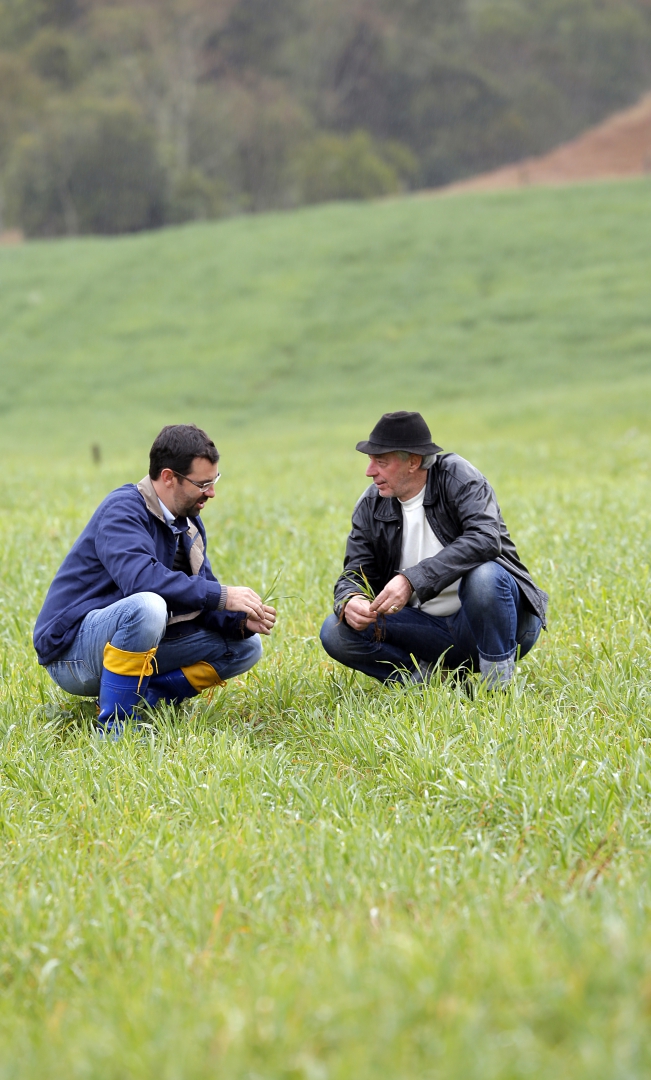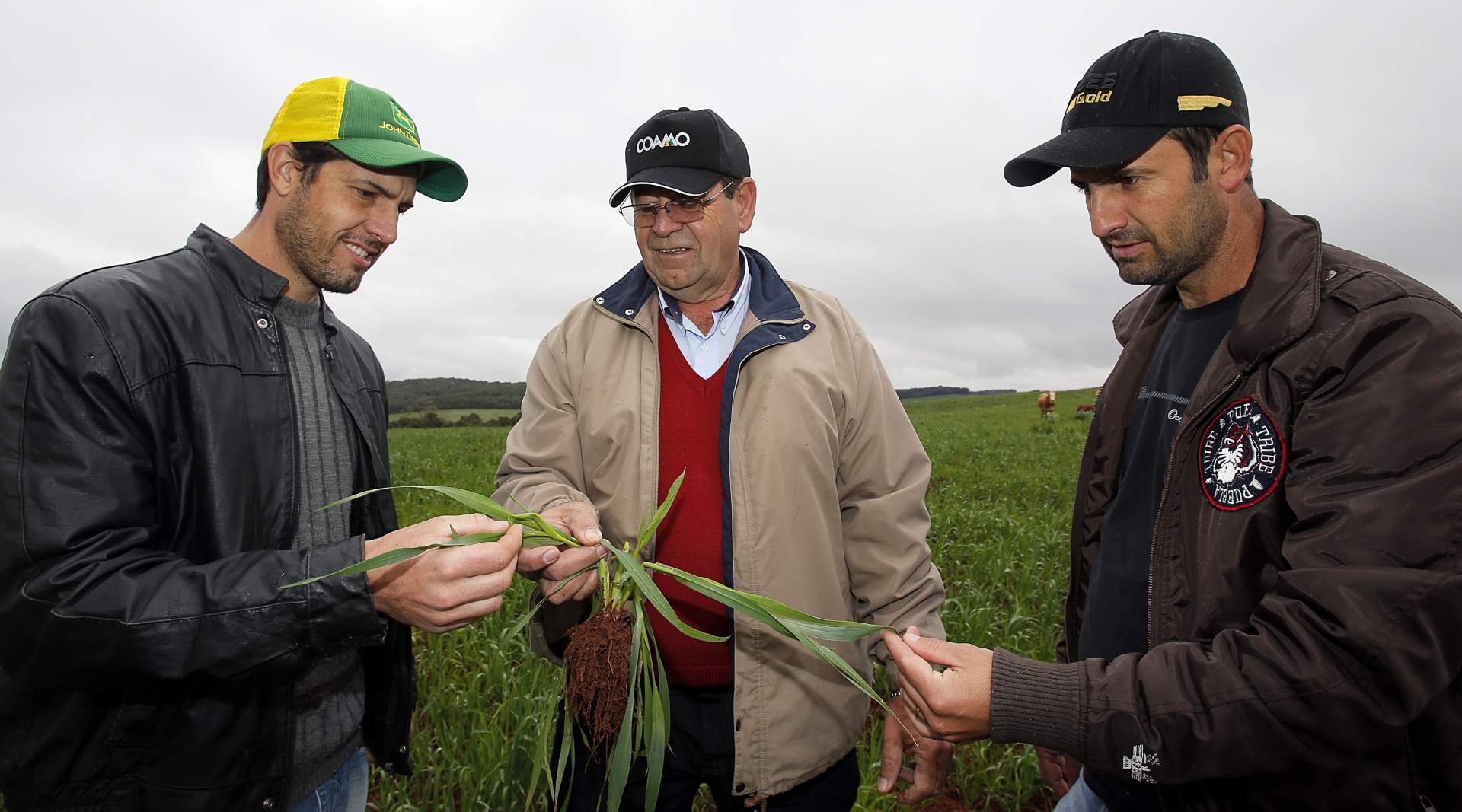 | Nairon Alpe de Quadros, engenheiro agrônomo da Coamo, acompanha com o cooperado Gilberto o desenvolvimento da aveia que serve de alimento para o gado no inverno |