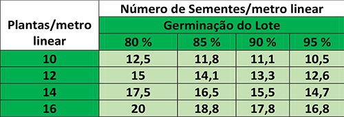 Um item de extrema importância que deve ser observado no momento do plantio é a densidade de semeadura, pois para cada cultivar existe uma recomendação de população de plantas por hectare. Para se obter um estande ideal, deve-se calcular o número de sementes a serem distribuídas (conforme demonstrado na tabela abaixo com alguns exemplos). Para isso, se faz necessário conhecer o percentual de germinação do lote de semente.