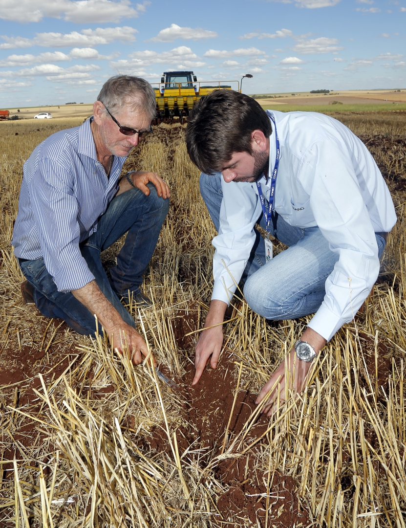 | Semente da soja já está no solo. Palhada do trigo ajuda no manejo e beneficia a próxima safra que se inicia. Altamir acompanha plantio com o agrônomo Diego Monteiro, de Mamborê |
