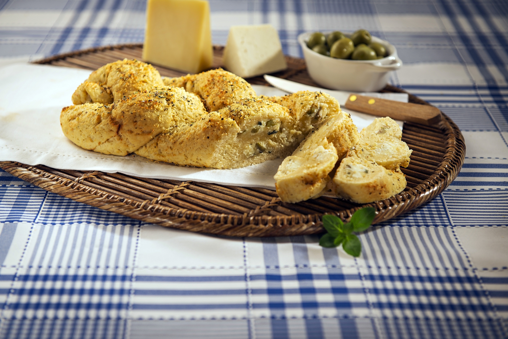 Massa: Misture 1 xícara de Farinha de Trigo Coamo com o fermento e depois acrescente os outros ingredientes, faça uma pasta e por último adicione aos poucos o restante da farinha. Trabalhe com as mãos para obter uma massa macia e lisa, deixe crescer por 1 hora. Em superfície polvilhada com farinha, abra a massa com um rolo e dívida em três partes, recheie cada uma e feche formando três tiras. Modele o pão trançando a massa, começando a unir as tiras pelo centro, fechando nas pontas. Coloque em assadeira untada com Margarina Coamo Extra Cremosa e polvilhada com Farinha de Trigo Coamo. Pincele com a mistura e polvilhe com queijo parmesão ralado e orégano. Deixe crescer novamente, por mais 30 minutos ou até ficar uma massa fofinha. Asse em forno préaquecido em temperatura de 180°C até dourar.