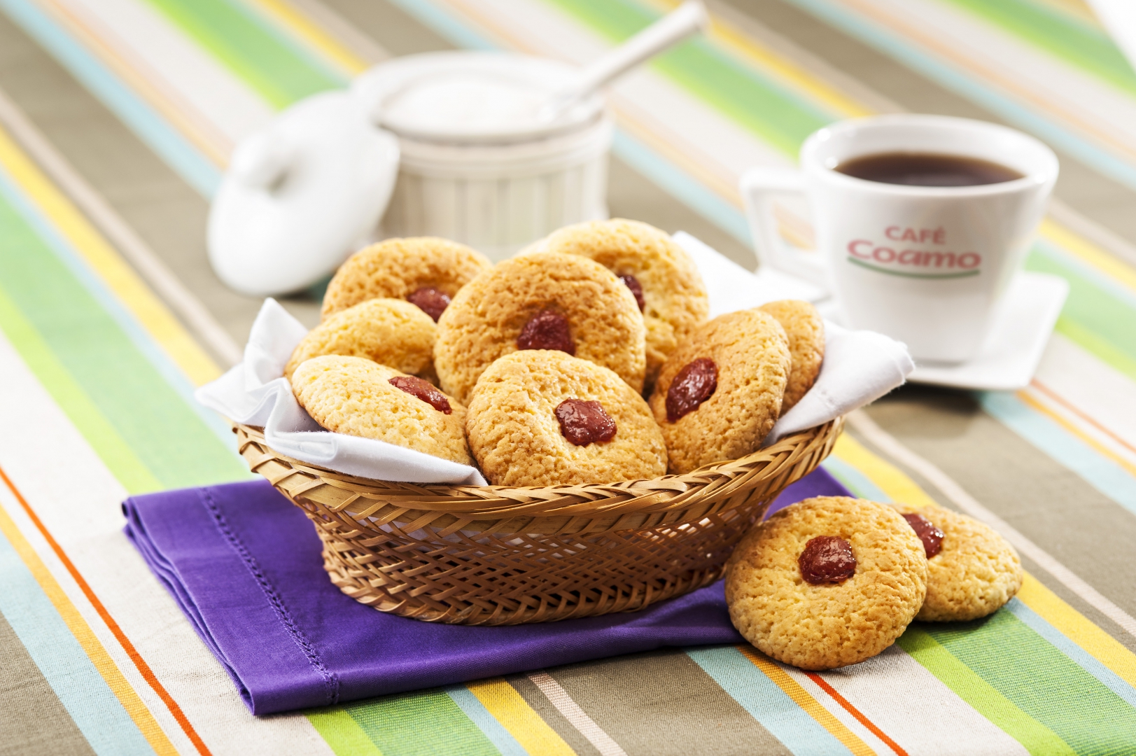 Divida a massa em pequenas partes no tamanho aproximado de uma colher de sopa, faça bolinhas e acomode-as em assadeiras untadas com Margarina Coamo Família, coloque um pequeno pedaço de goiabada sobre cada uma delas.