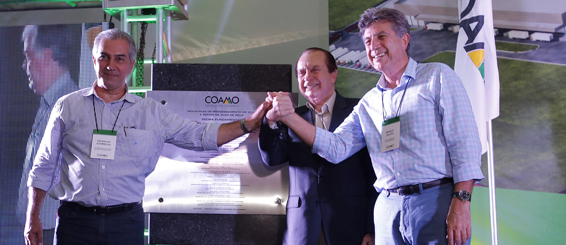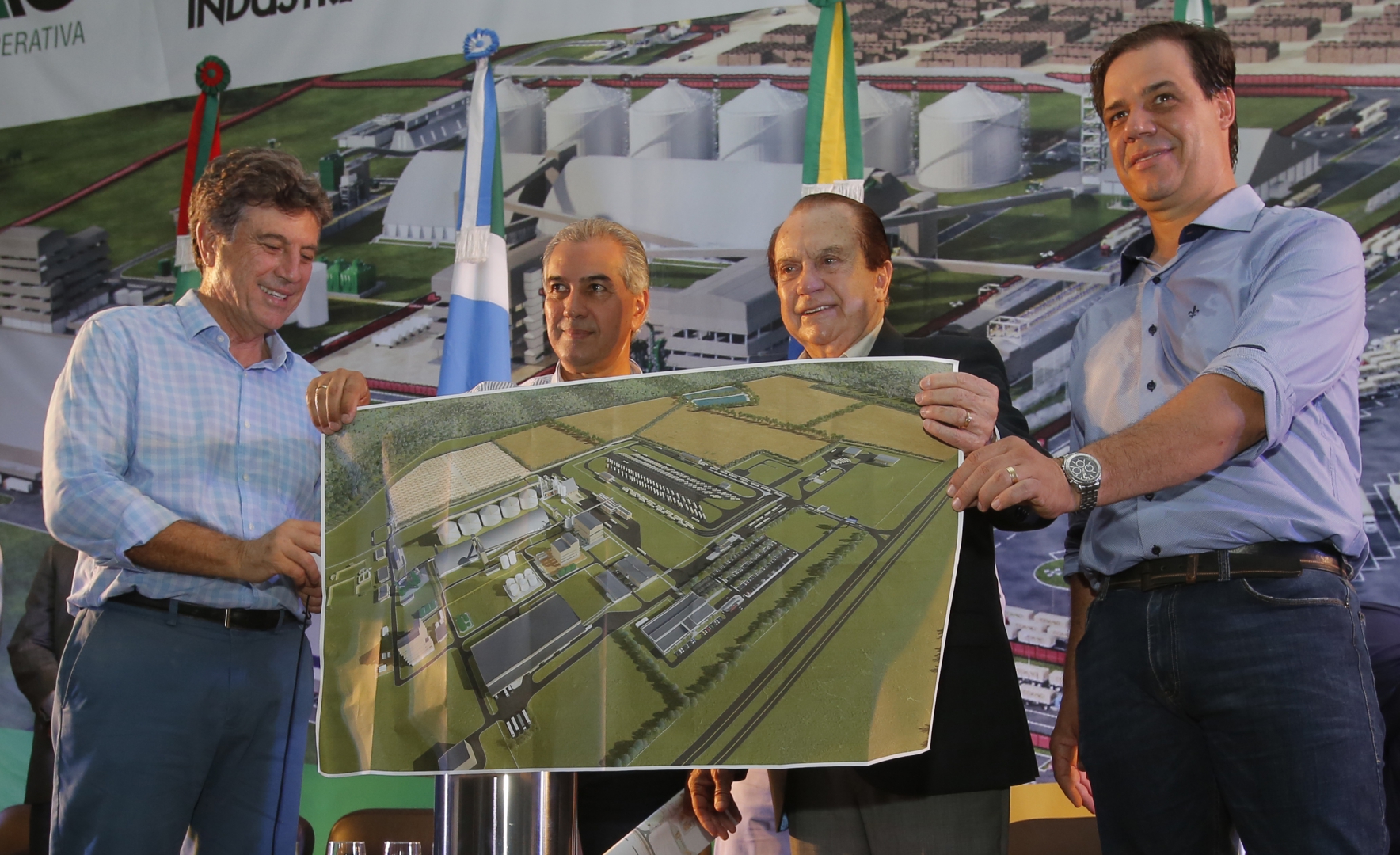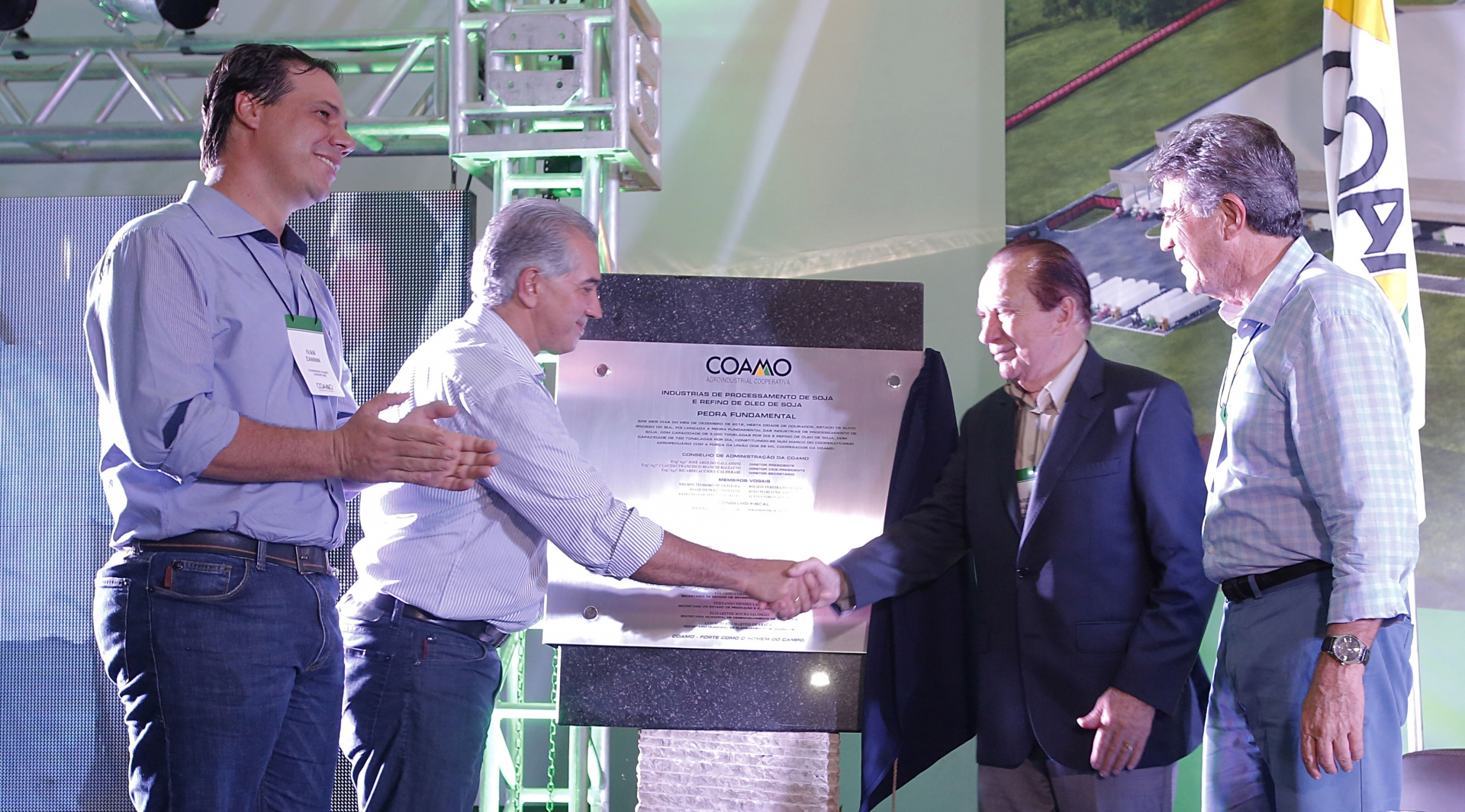 | Momento do descerramento da pedra fundamental das novas indústrias com Ivan Antonio Franzen Zanin, cooperado da Coamo em Caarapó, Reinaldo Azambuja, governador do Mato Grosso do Sul, José Aroldo Gallassini e Murilo Zauith, prefeito de Dourado |