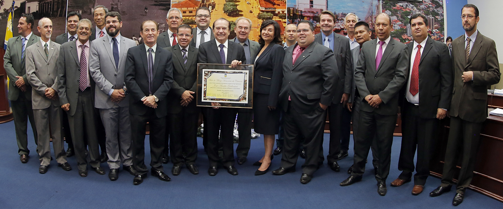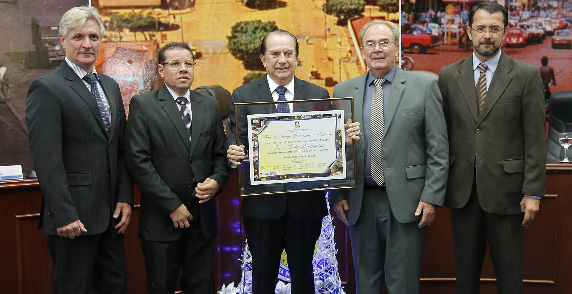 O engenheiro agrônomo José Aroldo Gallassini, idealizador e presidente da Coamo foi agraciado dia 5 de dezembro com o título de Amigo Honorário da Câmara Municipal de Dourados (MS). A sessão solene do Poder legislativo foi prestigiada por vereadores, cooperados e lideranças municipais.