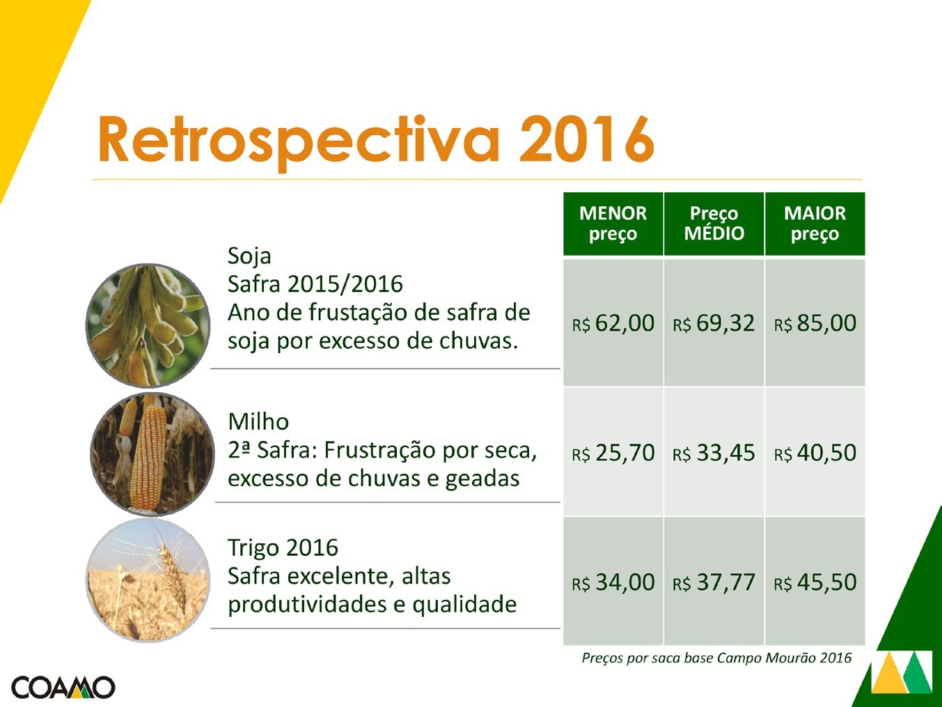 O preço médio ao cooperado em 2016 foi de R$ 70,00 por saca, superior aos R$ 60,00 por saca praticados em 2014 e 2015. O dólar teve uma média mais alta do que nos anos anteriores e a quebra da safra no Brasil sustentou os preços em Chicago.