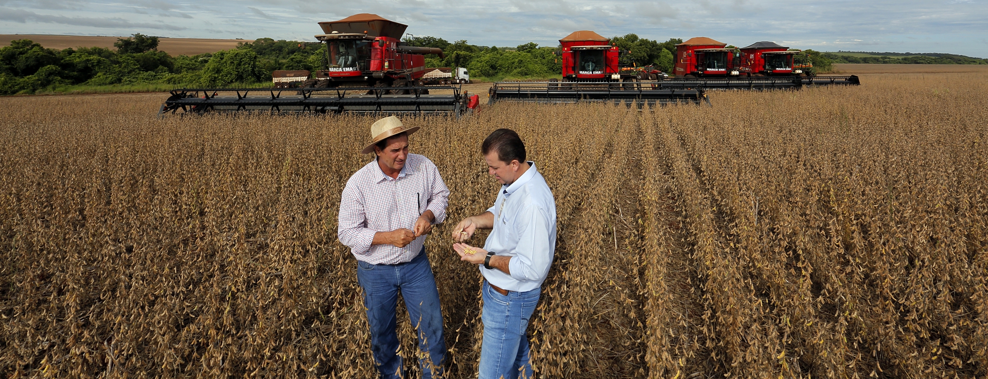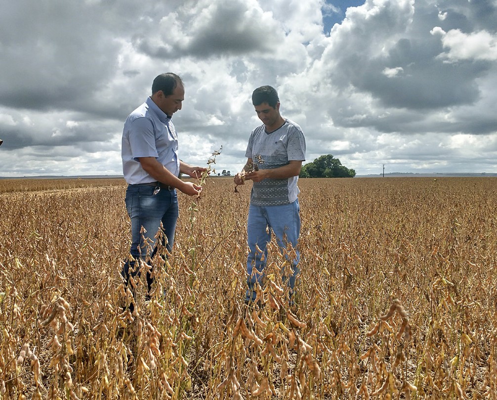 Cooperado Marcelo da Costa Nogueira, de Sidrolândia (Centro-Norte do Mato Grosso do Sul), se surpreendeu positivamente com o início da retirada da soja do campo. Agrônomo Jackson Roberto Tenfen, do Detec da Coamo em de Maracaju, analisa lavoura com bom potencial produtivo