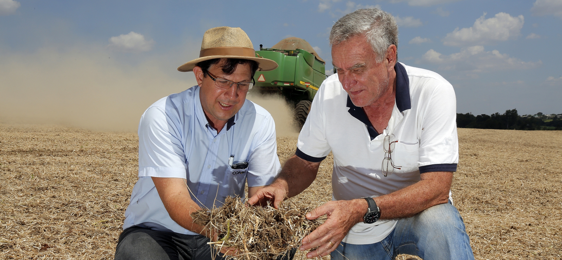 Engenheiro agrônomo Mauro Bruno Orso, do Detec da Coamo em Toledo, acompanha com o cooperado Ângelo Caetano Costamilan, a palhada deixada pela soja e que beneficia o milho de segunda safra