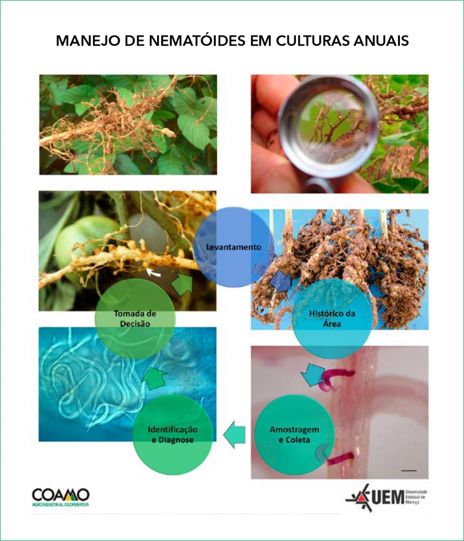 Com experiência de mais de 20 anos, a nematologista Claudia Dias Arieira, da Universidade Estadual de Maringá (UEM), diz que a primeira ação a ser tomada é realizar o levantamento para identificação da presença ou não de nematóides na área. “Quando o produtor vê as reboleiras ou manchas na lavoura ele costuma achar que é algum problema de nutrição ou compactação e acaba não fazendo análise, quando na verdade podem ser nematóides. É importante procurar o agrônomo que presta assistência técnica para os dois juntos traçarem as estratégias de manejo, uma vez que cada nematóide tem a sua particularidade”, argumenta a pesquisadora, alertando que nenhuma estratégia usada isoladamente vai dar bom resultado. “Por isso utilizamos a rotação de culturas com plantas não hospedeiras, para cada espécie existe uma indicação. Usamos ainda o tratamento químico, biológico ou associados, além de evitar a planta hospedeira na segunda safra para quebrar o ciclo e sempre que for possível fazer adubação verde para gerar matéria orgânica naquela área”, finaliza.