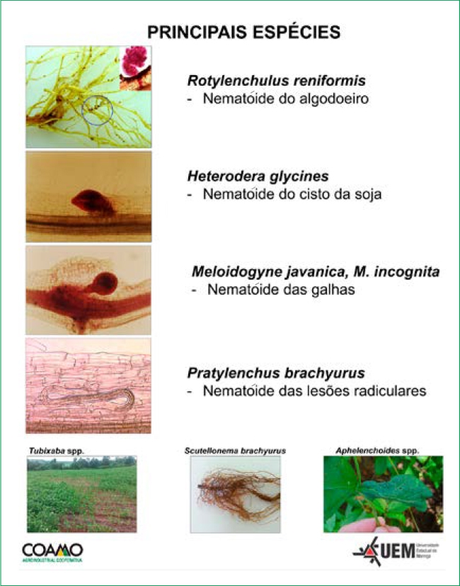 Entre os nematóides são quatro as espécies predominantes: Rotylenchulus reniformis (nematóide do algodoeiro que também causa dano na soja); Heterodera glycines (nematóide do cisto da soja com 11 raças catalogadas no Brasil, sendo oito em Mato Grosso do Sul e uma no Paraná); Meloidogyne incognita e Meloidogyne javanica (nematóide das galhas) e o Pratylenchus brachyurus.