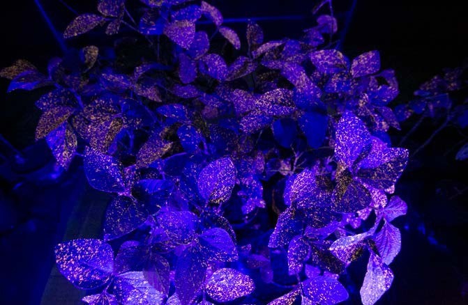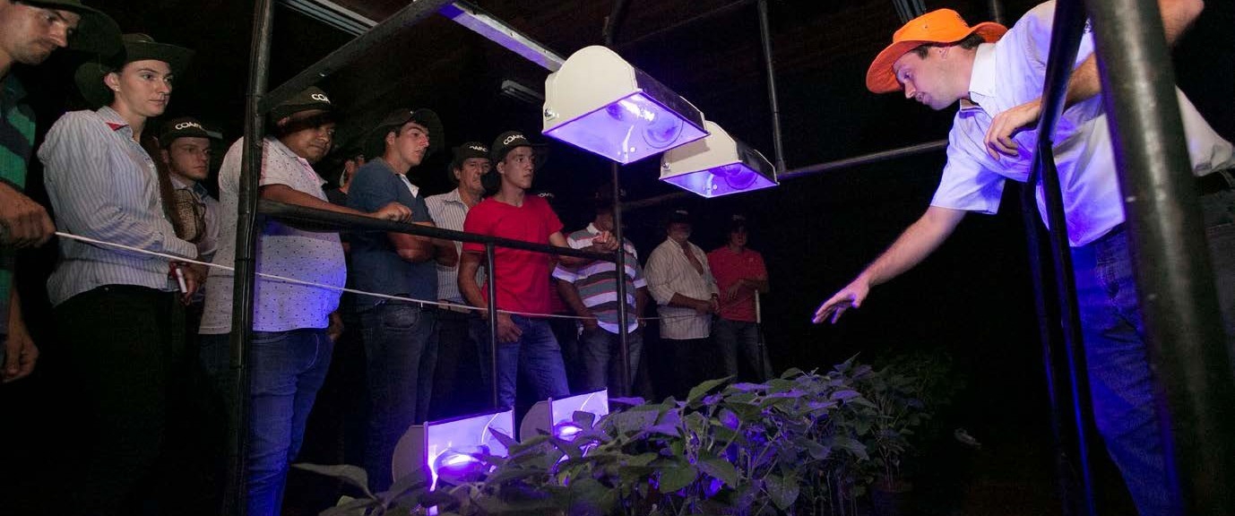 Em uma sala escura, com a utilização de corante e luz negra, cooperados puderam visualizar a cobertura e penetração de gotas na lavoura
