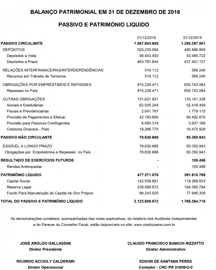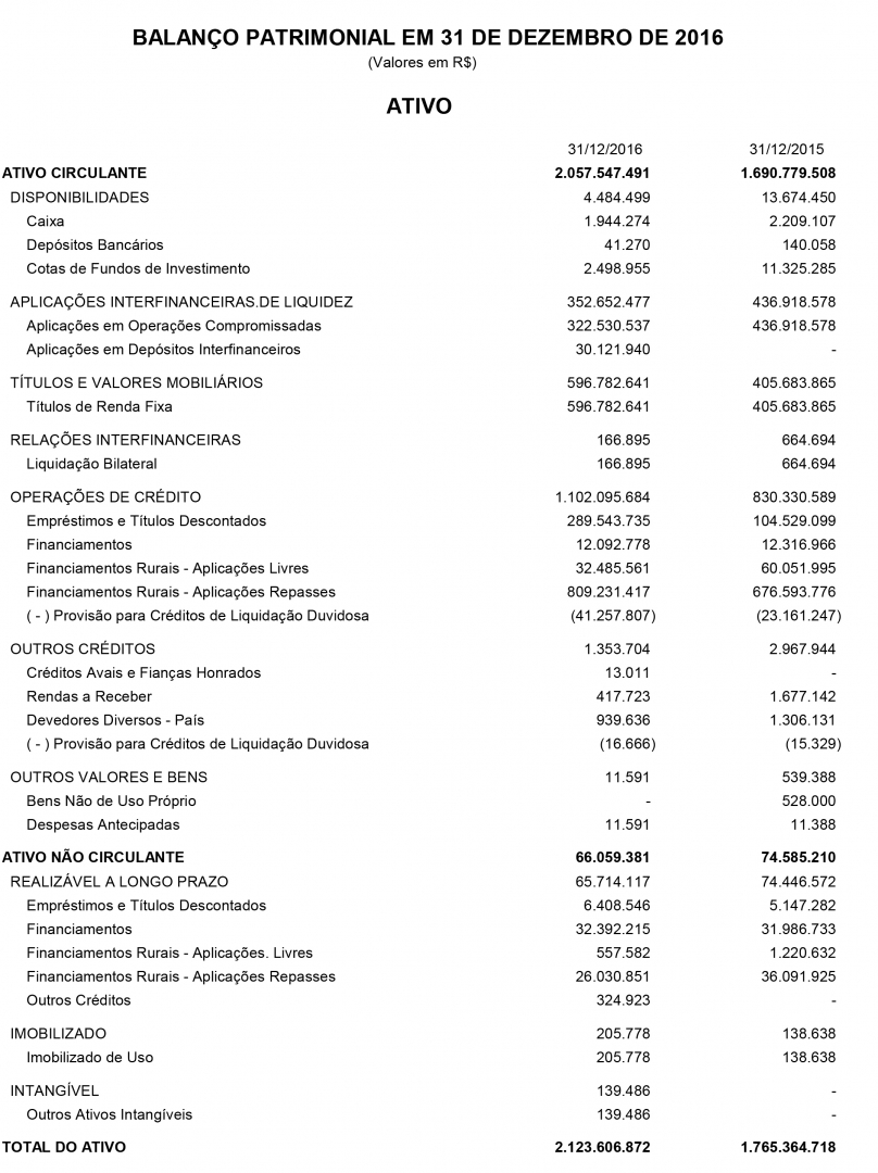 BALANÇO PATRIMONIAL EM 31 DE DEZEMBRO DE 2016