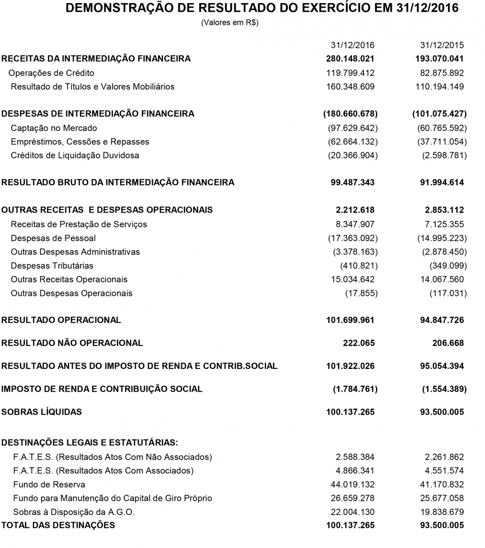 DEMONSTRAÇÃO DE RESULTADO DO EXERCÍCIO EM 31/12/2016