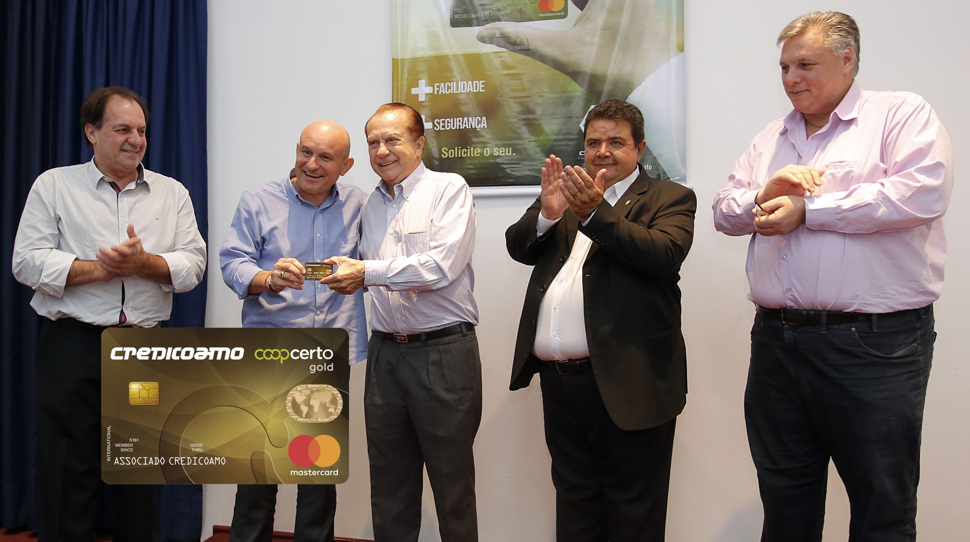 Enio Meinen, diretor de Operações do Bancoob, entrega o cartão a José Aroldo Gallassini, ladeados por Marino Delgado (Sicoob), Marcio Lopes de Freitas (OCB) e Jeferson Nogarolli (Sicoob)