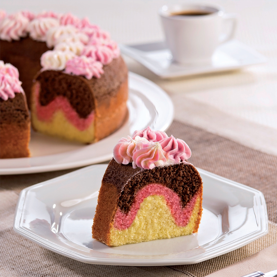 Massa: Bata cada uma das massas na batedeira ou no batedor manual, controlando a Farinha de Trigo Coamo para obter consistências iguais em cada uma. Coloque as massas alternadas. Use colheradas de cada sabor em uma fôrma de bolo com furo no meio, fartamente untada com Margarina Coamo. Asse em forno, preaquecido, à temperatura de 200 °C para dourar.