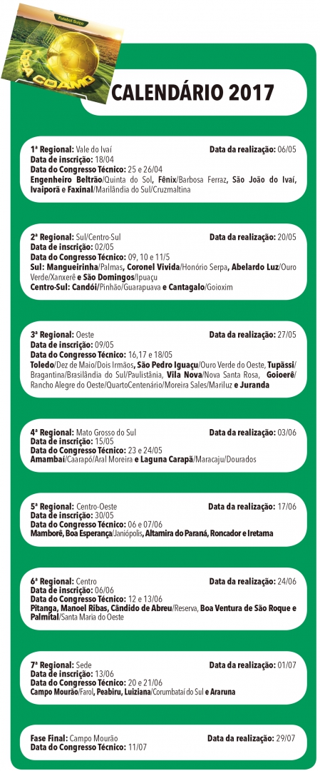 Considerado o maior evento rural esportivo do Brasil, a Copa Coamo 2017 será disputada em sete fases regionais – de 06 de maio a 1º de julho –, nas quais serão classificadas 33 equipes para a final no dia 29 de julho, em Campo Mourão.