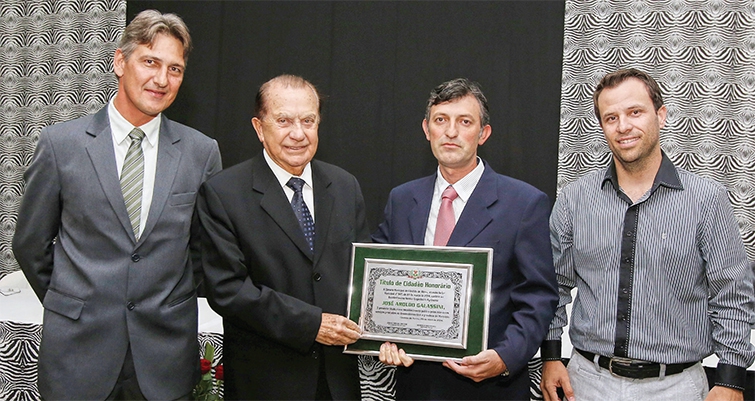 O engenheiro agrônomo José Aroldo Gallassini, idealizador e presidente da Coamo, foi agraciado na noite de 28 de abril com o título de Cidadão Honorário de Cândido de Abreu (Centro-Norte do Paraná). A honraria foi entregue em sessão solene da Câmara Municipal com a presidência do vereador Josnei Eriva.