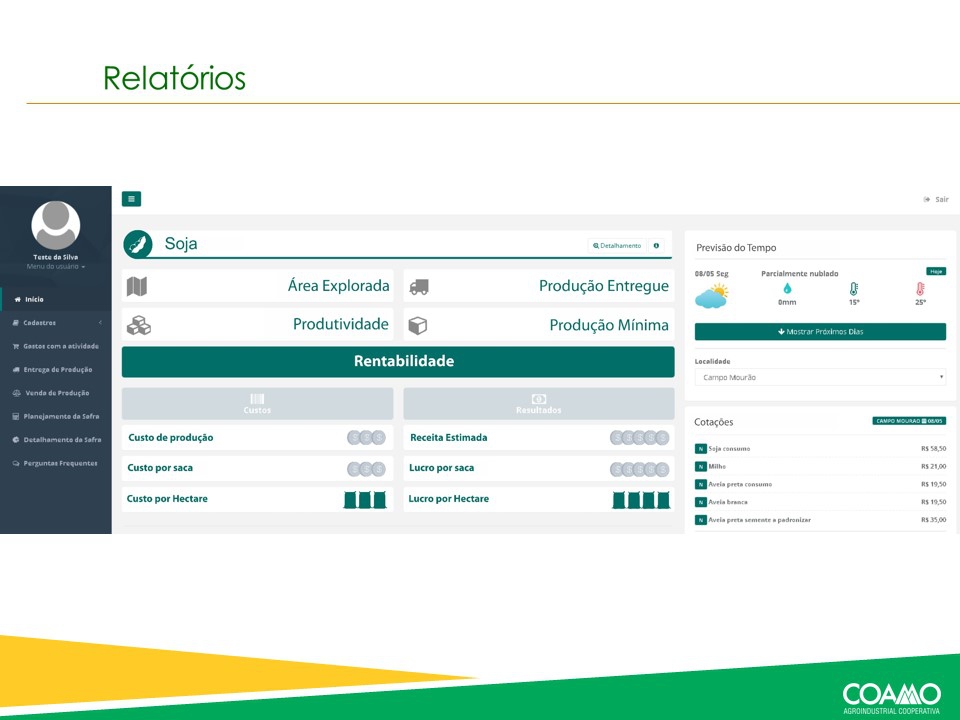 O engenheiro agrônomo Guilherme Montenegro Savio, chefe do Departamento de Cooperativismo da Coamo, ressalta que o Gestor Rural é um sistema web de gerenciamento rural desenvolvido em benefício do cooperado. “O programa auxiliará o cooperado a gerir a atividade, fornecendo o histórico de produtividade, de custo de produção e rentabilidade, sempre com o objetivo central de criar indicadores para a melhor tomada de decisão”, assinala.