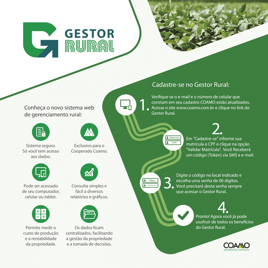 Sempre atenta a demanda dos cooperados e com o intuito de fazer com que se desenvolvam, cada vez mais, a Coamo está lançando uma ferramenta para ajudar na gestão da propriedade. Trata-se do programa Gestor Rural Coamo, que está à disposição de todos cooperados.