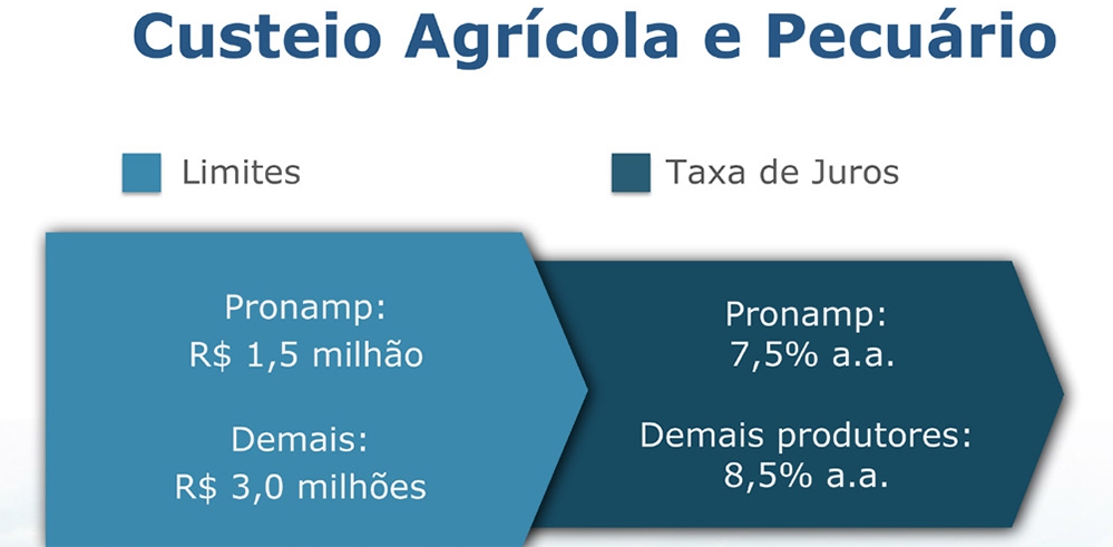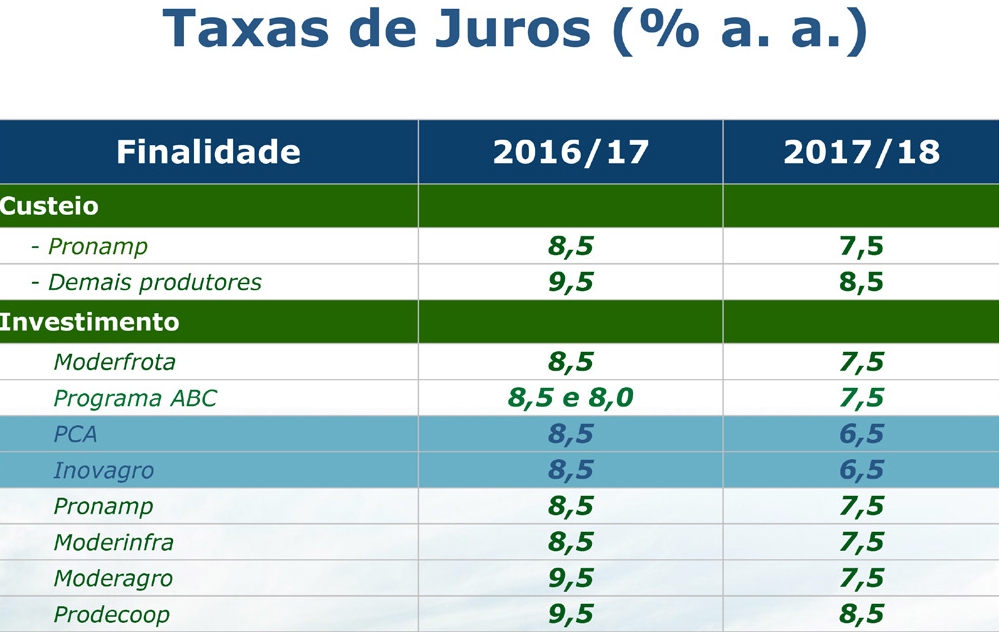 No custeio, os juros caíram de 8,5% ao ano e 9,5% ao ano para 7,5% e 8,5%. O mesmo aconteceu para os programas de investimento, à exceção do PCA e Inovagro, nos quais a taxa foi fixada em 6,5% ao ano.