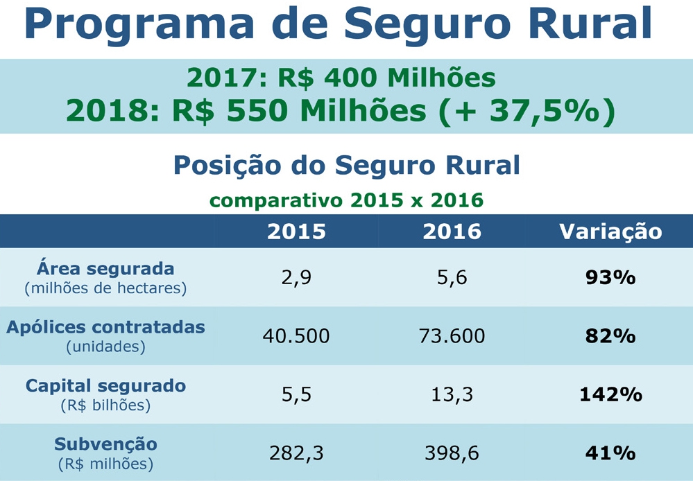 Em 2018, o produtor poderá contar com R$ 550 milhões do Programa de Subvenção ao Prêmio do Seguro Rural (PSR), com aumento de 37,5%. O PSR oferece ao agricultor a oportunidade de proteger sua produção agrícola com custo reduzido, por meio de auxílio financeiro do governo federal.