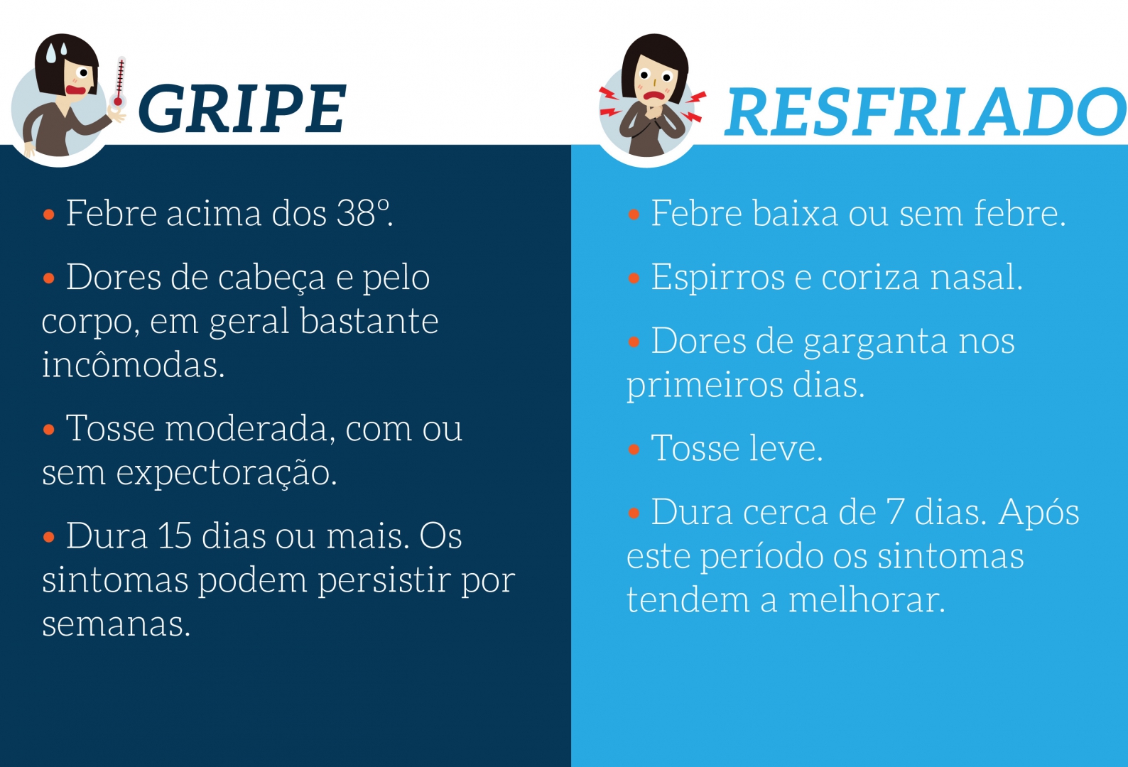 Resfriados possuem sintomas leves, como pouca ou nenhuma febre, espirros e coriza, que não comprometem o estado geral do paciente. Já a gripe, causada pelos vírus influenza, é uma doença com sintomas mais graves, como febre alta, fadiga e comprometimento respiratório.