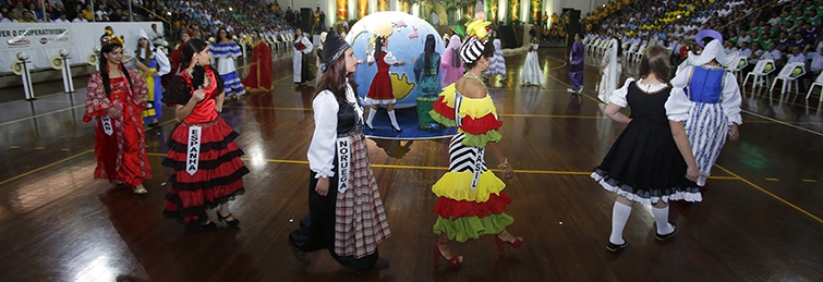 | As madrinhas das equipes estavam vestidas com trajes típicos de países que receberam e recebem os produtos in natura e industrializados pela Coamo |