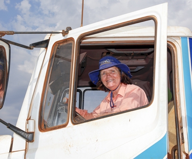 | Dona Valy Dummer, de Mamborê (PR), durante visita à industria de óleo da Coamo e dias depois dirigindo o caminhão com insumos para o plantio da soja |