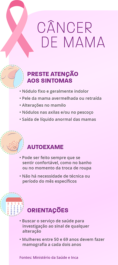 Além de estar atenta ao próprio corpo, também é recomendado que mulheres de 50 a 69 anos façam uma mamografia de rastreamento (quando não há sinais nem sintomas) a cada dois anos. Esse exame pode ajudar a identificar o câncer antes do surgimento dos sintomas.