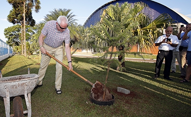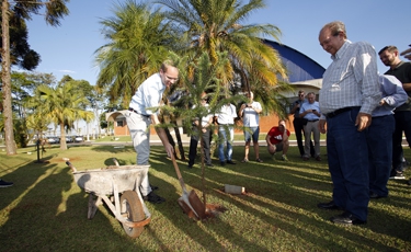 | Heinrich Heinz Neesen (a direita) e Alexander Fleming (a esquerda), que representou o pai Peter Fleming, durante plantio de um pinheiro na sede da Arcam |