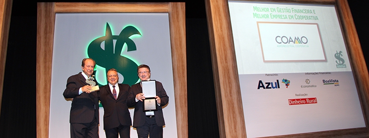 A Coamo foi premiada na noite de 27 de novembro, em São Paulo, como a melhor Cooperativa Agrícola do Brasil e com a melhor Gestão Financeira entre as cooperativas. O destaque foi na premiação “As Melhores da Dinheiro Rural 2017”. O reconhecimento é uma iniciativa da Editora Três, que seleciona as companhias que atuam no agronegócio e que apresentaram o melhor desempenho em seu setor de atuação em 2016. A Coamo foi representada pelo diretor-secretário Ricardo Accioly Calderari e pelo superintendente Comercial Alcir José Goldoni.
