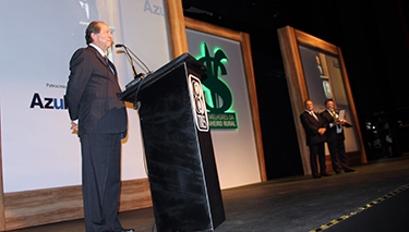 | Ricardo Calderari subiu no palco ao lado de Alcir Goldoni para receber os dois troféus, entregues por Roberto Rodrigues, ex-ministro da Agricultura e embaixador especial da ONU para as cooperativas |