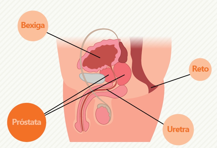 | É uma glândula presente nos homens, localizada na frente do reto, abaixo da bexiga, envolvendo a parte superior da uretra (canal por onde passa a urina). A próstata não é responsável pela ereção nem pelo orgasmo. Sua função é produzir um líquido que compõe parte do sêmen, que nutre e protege os espermatozoides. Em homens jovens, a próstata possui o tamanho de uma ameixa, mas seu tamanho aumenta com o avançar da idade. |