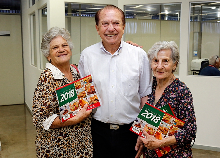 Em Campo Mourão (Centro-Oeste do Paraná), a cooperada Helena Medeiros Ritt chegou logo cedo e foi uma das primeiras a ser atendida. Ao lado da irmã Leocádia, fez questão de tirar uma foto com o presidente da Coamo, José Aroldo Gallassini. “É um presente que recebemos da cooperativa. Vou usar o dinheiro para comprar algumas lembrancinhas para a família. É muito bom ser cooperada da Coamo, pois temos vários benefícios, e um deles é essa antecipação das sobras.”