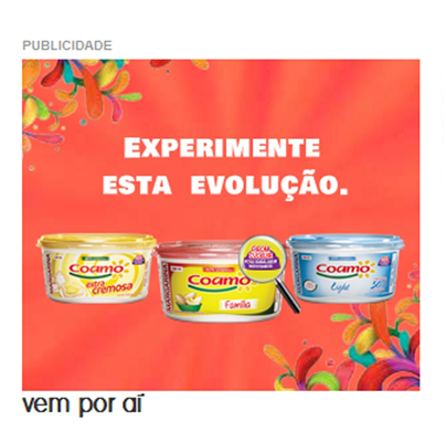 Os Alimentos Coamo realiza desde o início de junho uma ação inédita com o portal de notícias e entretenimento Globo.com. Na página de entretenimento deste portal, onde estão os link’s das novelas ‘Em Família’, ‘Geração Brasil’ e ‘Meu pedacinho de chão’, há no canto superior direito, um banner animado de cinco segundos com o resumo da cena mais marcante do filme da campanha “É Bom Evoluir”, referente ao relançamento das margarinas Coamo Família, Coamo Extra Cremosa e Coamo Light. Além disso, com um clique, este banner remeterá o internauta ao site dos Alimentos Coamo, onde será possível assistir o filme na integra e navegar por todo o conteúdo do site.