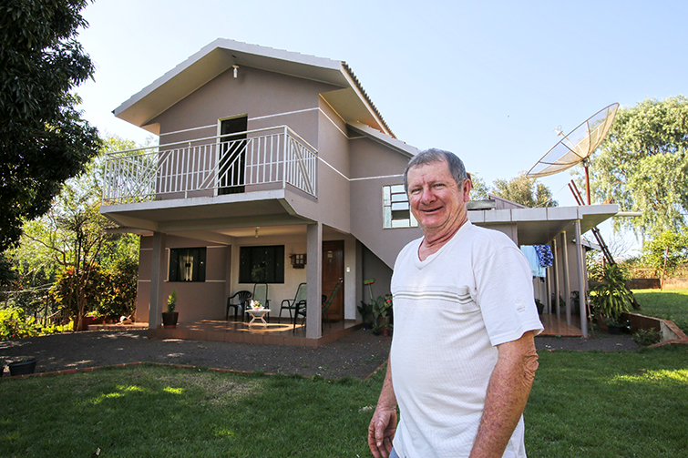 Reformar a sua casa e ainda construir outra para o filho na mesma propriedade, uma realização que ‘seo’ Elemar Krebs, de Tupãssi, Oeste do Paraná conhece muito bem. Por meio do programa Moradia Feliz o cooperado está rindo a toa, pois agora além de estar com sua casa nova, até o final do ano terá seu filho e a nora morando na mesma propriedade. “Acabei de reformar minha casa e estou construindo outra para meu filho que casou e está morando na cidade. Como ele trabalha comigo, resolvemos fazer mais uma casa que está entrando na fase final. Daqui uns dois três meses estará pronta e ainda neste ano ele muda”, revela.