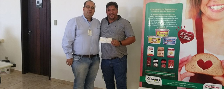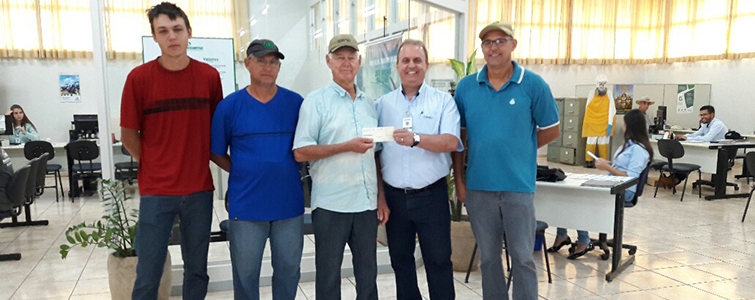 | Alcides Brunetta de Mamborê (Centro-Oeste do Paraná) acompanhado da esposa Vanice e da filha Geovana Brunetta Patrício recebe cheque das mãos do presidente da Coamo, José Aroldo Gallassini |